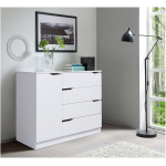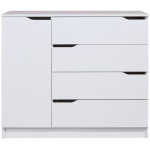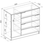 Четыре вместительные выдвижные ящика комода расположены справа, слева — за распашной дверкой отделение с полкой. Универсальной сборки нет.