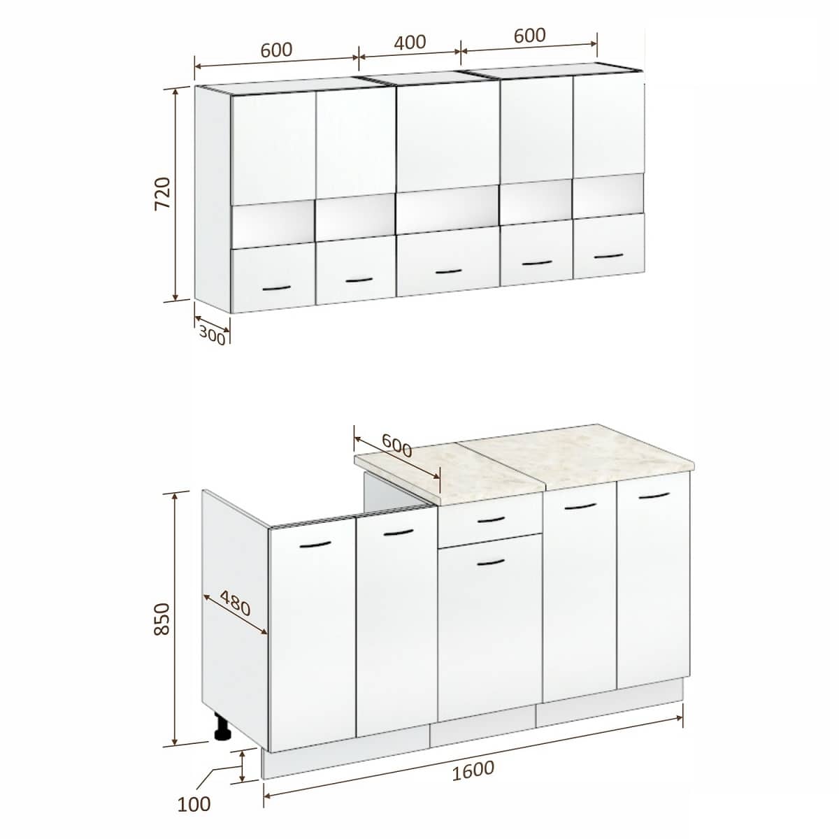 Техническое описание кухни: Ширина кухни: 160.0 см. Высота напольных шкафов с учетом столешницы и ножек: 85.0 см. Высота навесных шкафов: