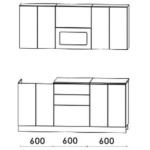 Характеристики: Ширина кухни: 180.0 см. Высота напольных шкафов с учетом столешницы и ножек: 85.0 см. Высота навесных шкафов: 72.0 см.