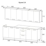 Характеристики: Ширина кухни: 240.0 см. Высота напольных шкафов с учетом столешницы и ножек: 85.0 см. Высота навесных шкафов: 57.0 см.