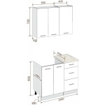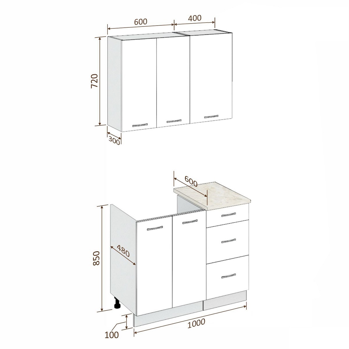 Характеристики: Ширина кухни: 100.0 см. Высота напольных шкафов с учетом столешницы и ножек: 85.0 см. Высота навесных шкафов: 72.0 см.