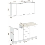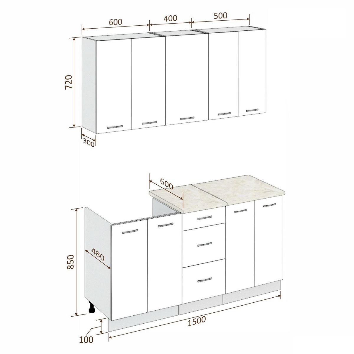 Характеристики: Ширина кухни: 150.0 см. Высота напольных шкафов с учетом столешницы и ножек: 85.0 см. Высота навесных шкафов: 72.0 см.