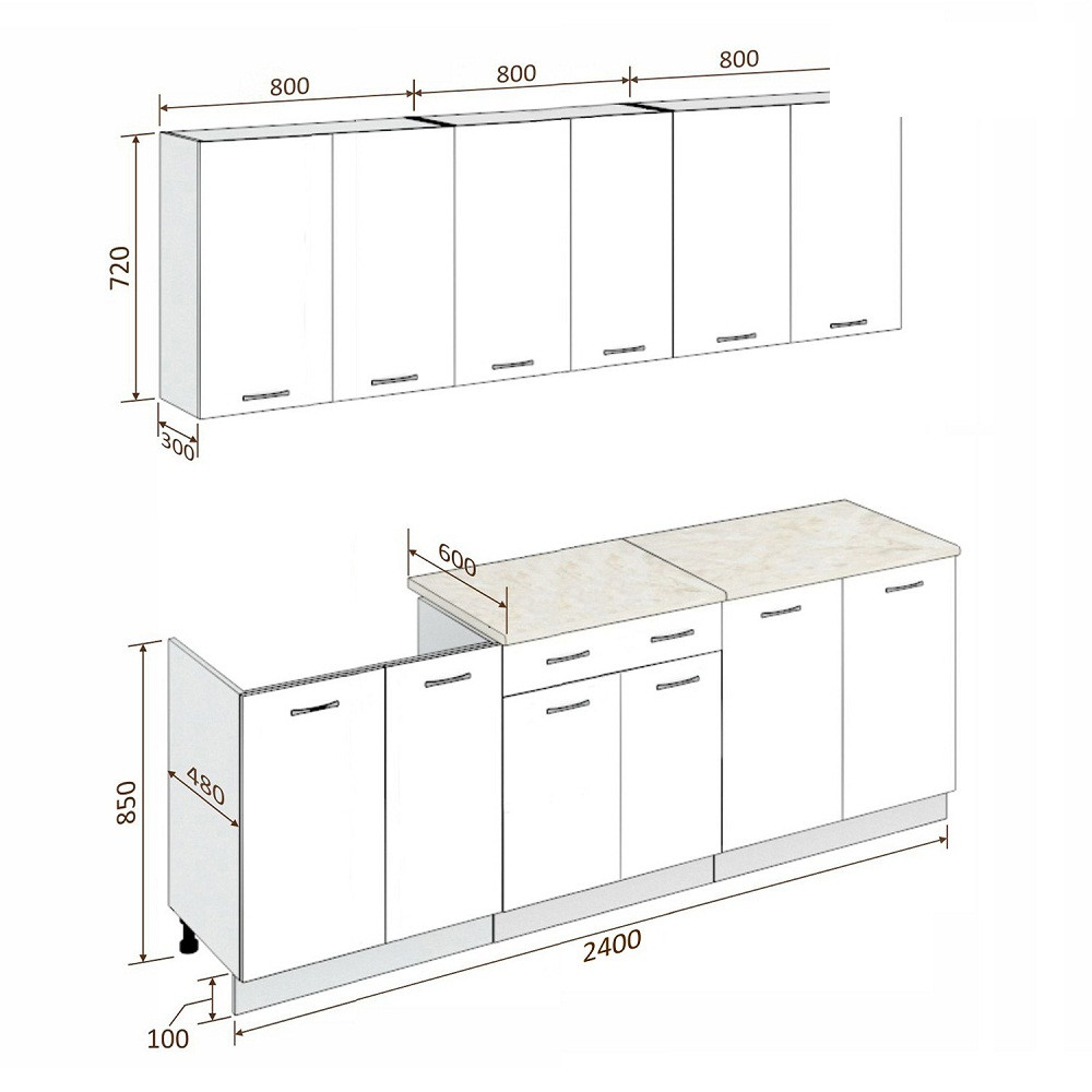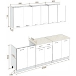 Характеристики: Ширина кухни: 240.0 см. Высота напольных шкафов с учетом столешницы и ножек: 85.0 см. Высота навесных шкафов: 72.0 см.