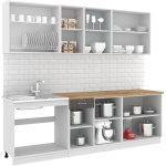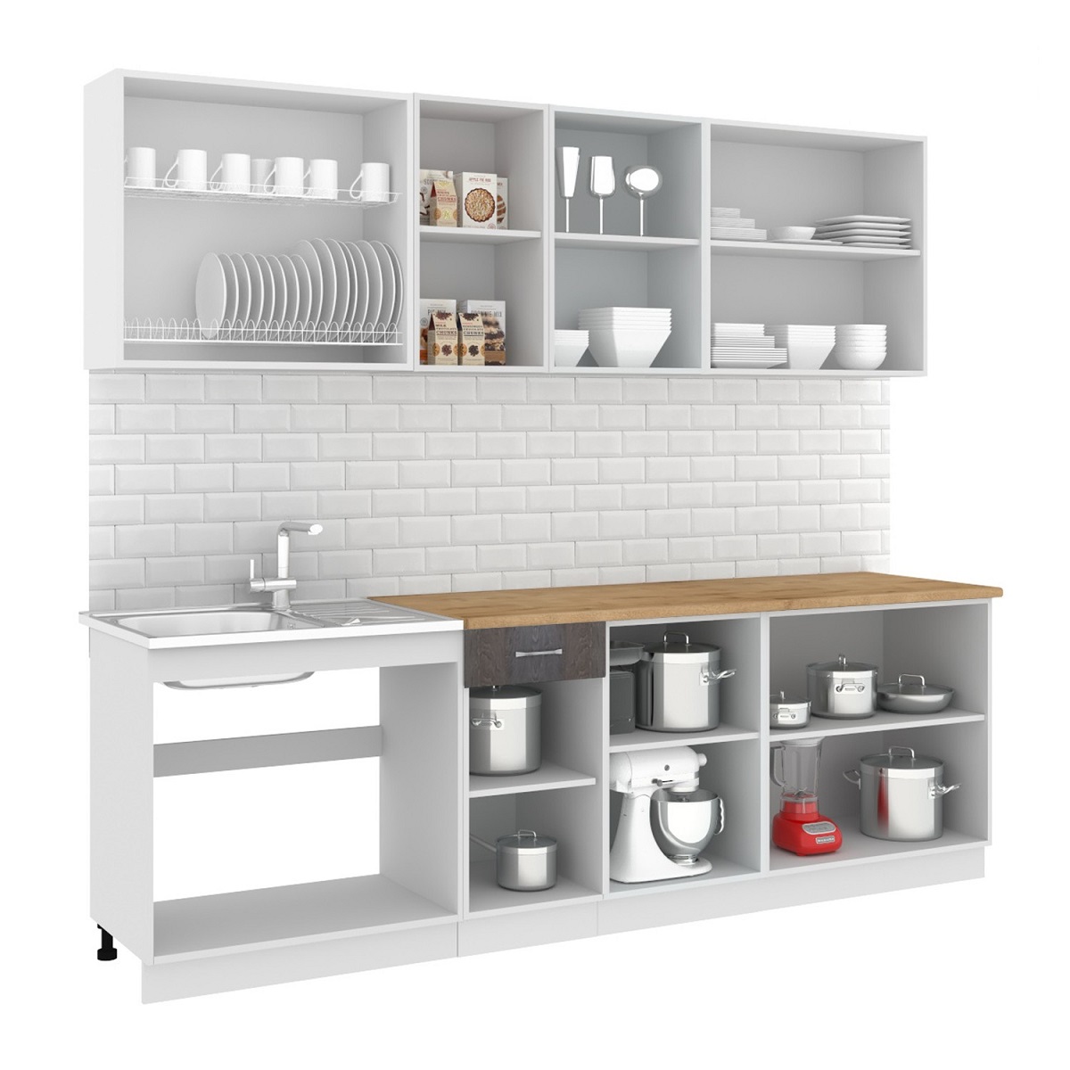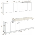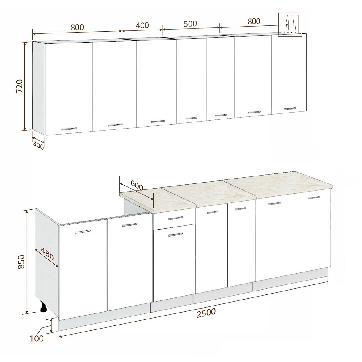 Характеристики: Ширина кухни: 250.0 см. Высота напольных шкафов с учетом столешницы и ножек: 85.0 см. Высота навесных шкафов: 72.0 см.