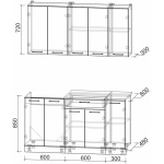 Характеристики: Ширина кухни: 150.0 см. Высота напольных шкафов с учетом столешницы и ножек: 85.0 см. Высота навесных шкафов: 72.0 см.