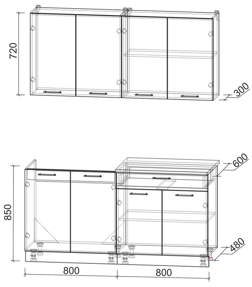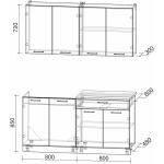 - Высота напольных шкафов с учетом столешницы и ножек: 85.0 см.