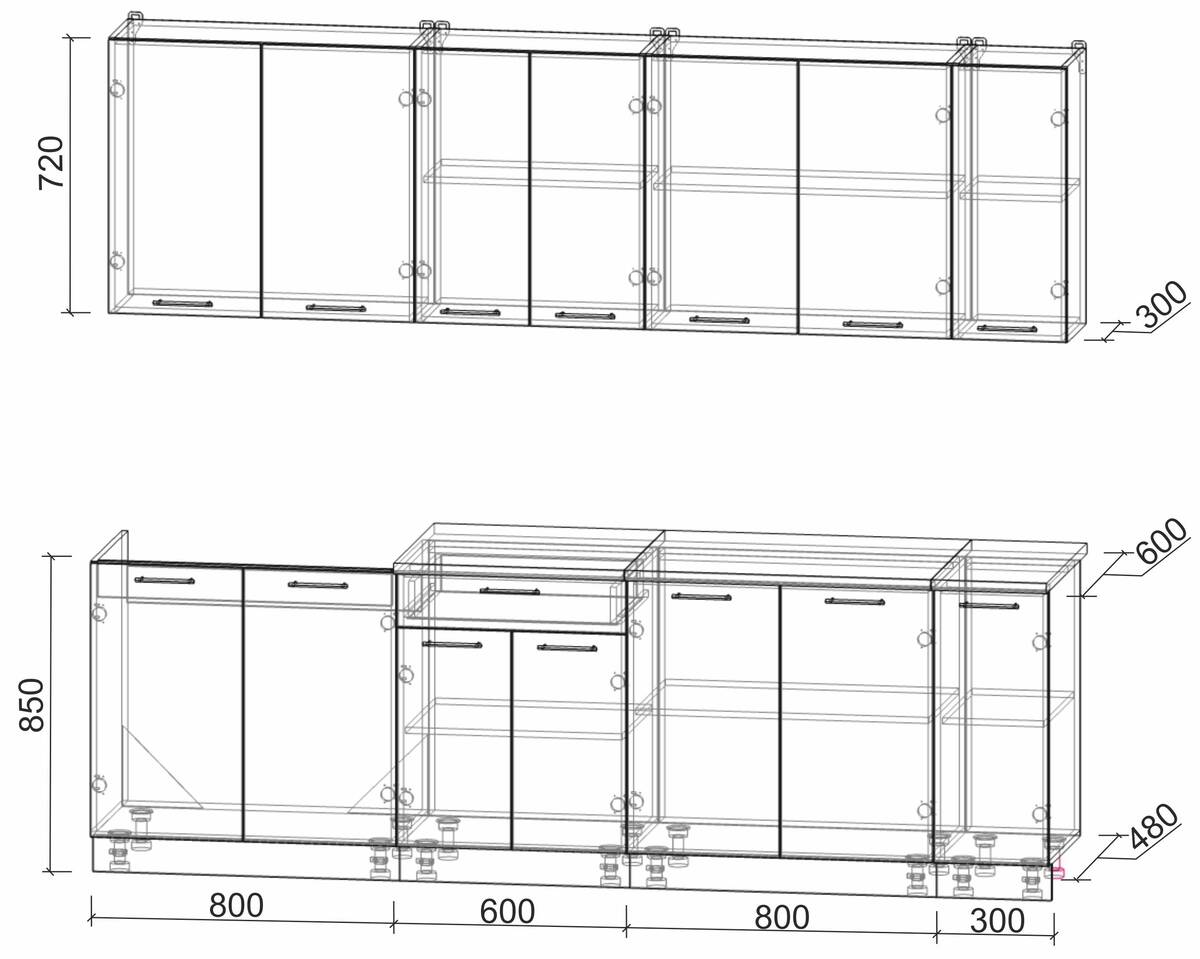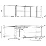 Характеристики: Ширина кухни: 250.0 см. Высота напольных шкафов с учетом столешницы и ножек: 85.0 см. Высота навесных шкафов: 72.0 см.