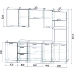 Характеристики: Ширина кухни: 250.0 см. Высота напольных шкафов с учетом столешницы и ножек: 85.0 см. Высота навесных шкафов: 72.0 см.