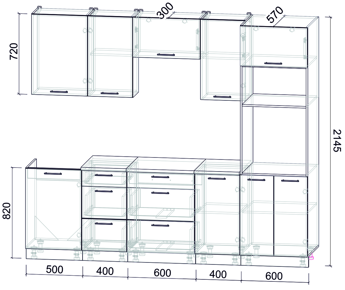 • Высота напольных шкафов с учетом столешницы и ножек: 85.0 см.