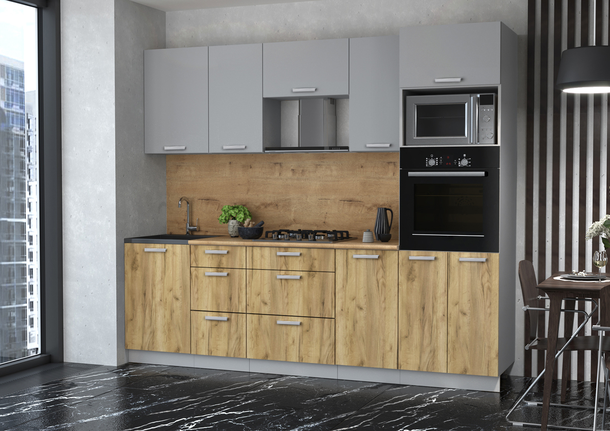 - Цвет фасадов (верх — низ): Серебро — Дуб золотой