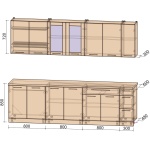 Характеристики: Ширина кухни: 270.0 см. Высота напольных шкафов с учетом столешницы и ножек: 85.0 см. Высота навесных шкафов: 72.0 см.