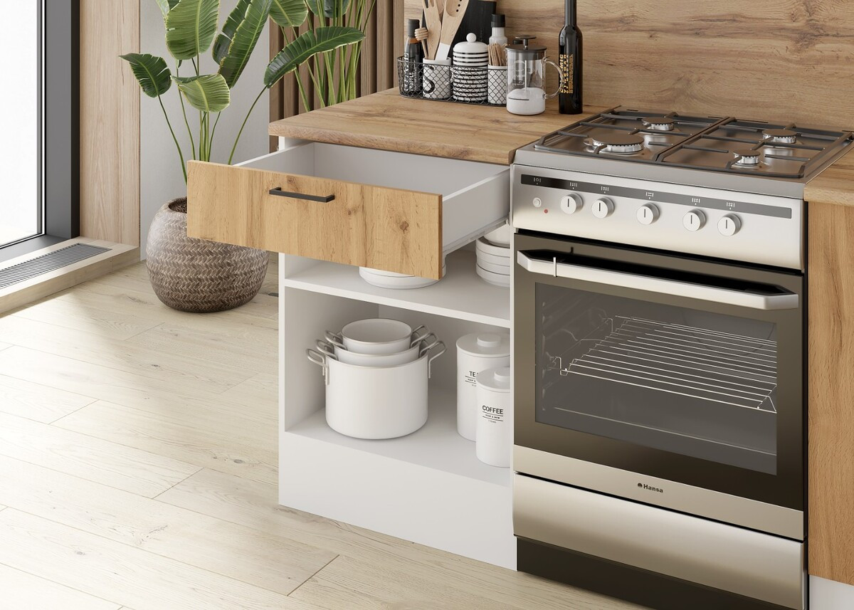 Гарнитур включает в себя просторные секции, которые обеспечивают удобное хранение и легкий доступ к кухонным принадлежностям.