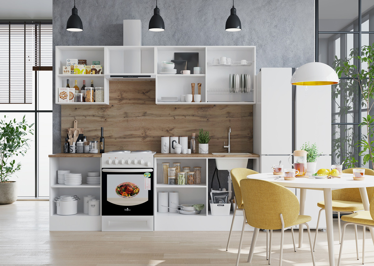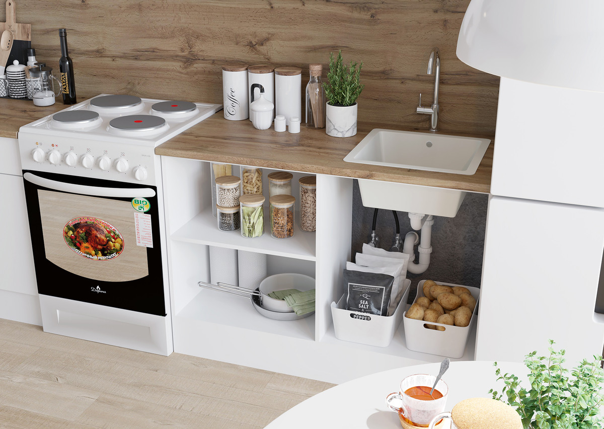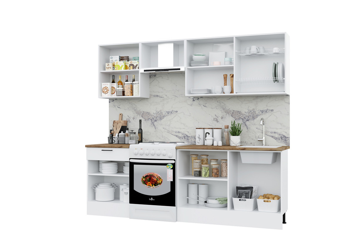 Гарнитур включает в себя просторные секции, которые обеспечивают удобное хранение и легкий доступ к кухонным принадлежностям.