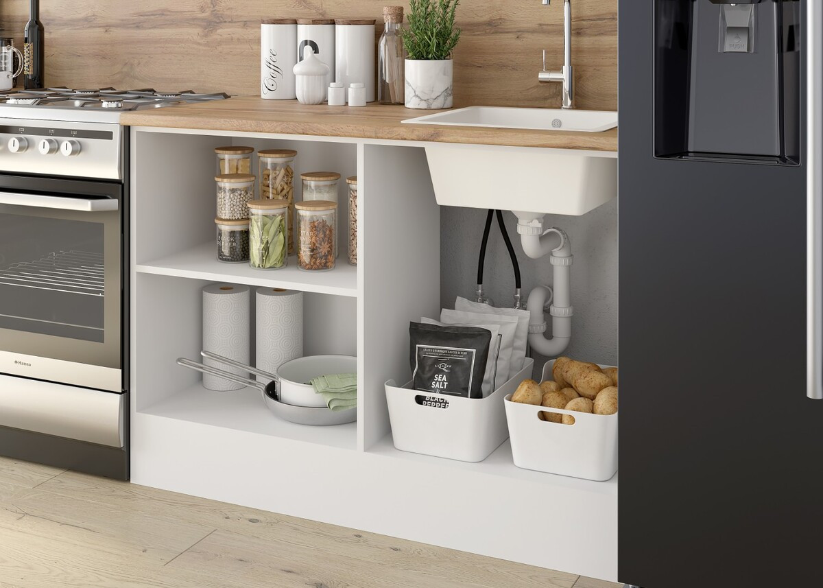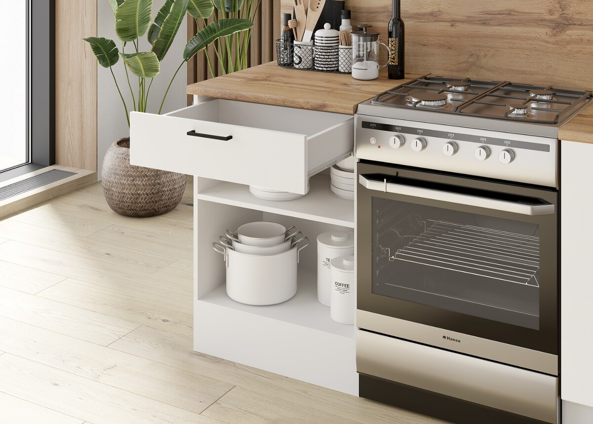 Гарнитур включает в себя просторные секции, которые обеспечивают удобное хранение и легкий доступ к кухонным принадлежностям.