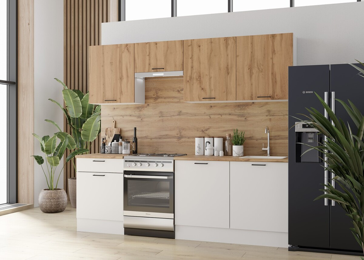 Характеристики: Ширина кухни: 240.0 см. Высота напольных шкафов с учетом столешницы и ножек: 85.0 см. Высота навесных шкафов: 72.0 см.