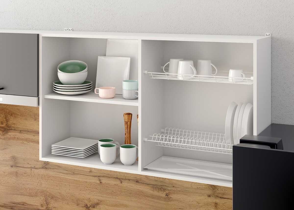 Гарнитур включает в себя просторные секции, которые обеспечивают удобное хранение и легкий доступ к кухонным принадлежностям.
