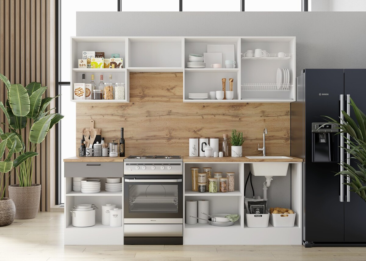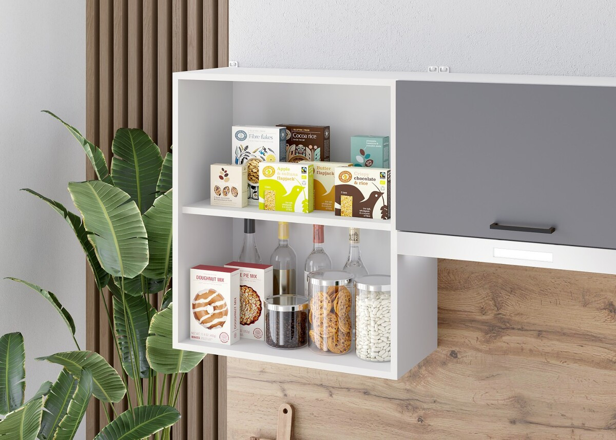 Гарнитур включает в себя просторные секции, которые обеспечивают удобное хранение и легкий доступ к кухонным принадлежностям.
