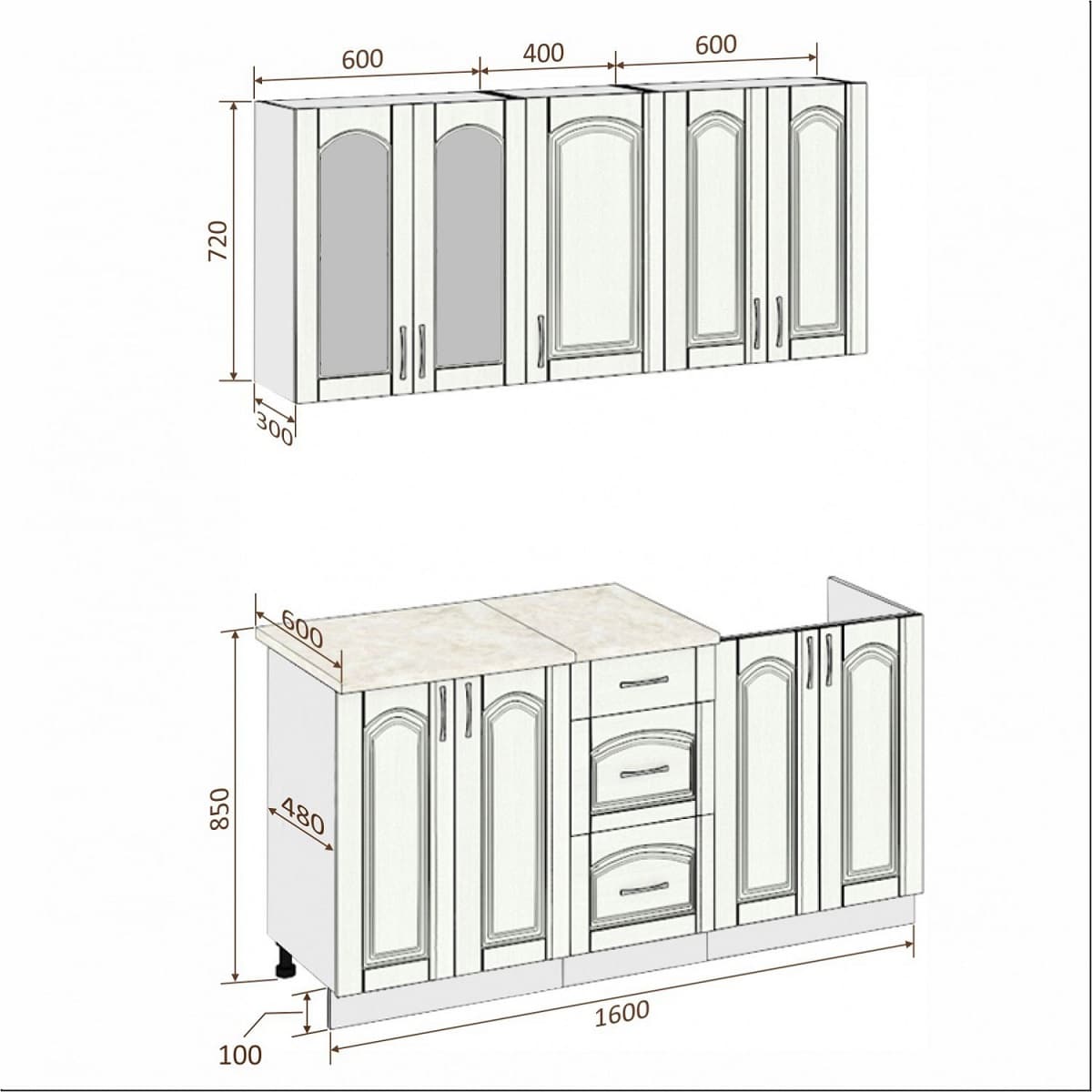Техническое описание кухни: Ширина кухни: 160.0 см. Высота напольных шкафов с учетом столешницы и ножек: 85.0 см. Высота навесных шкафов: