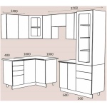 Техническое описание кухни: Тип: угловая кухня. Размер кухни: 1200 х 1200 мм.  Высота напольных шкафов с учетом столешницы и ножек: