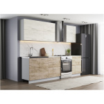 Кухонный гарнитур “Яна” выполнен в светлой древесной гамме на сером корпусе.
