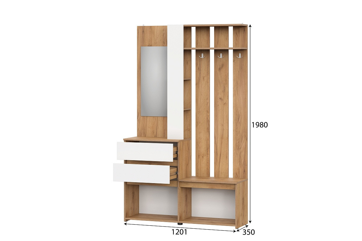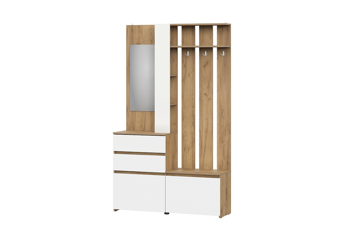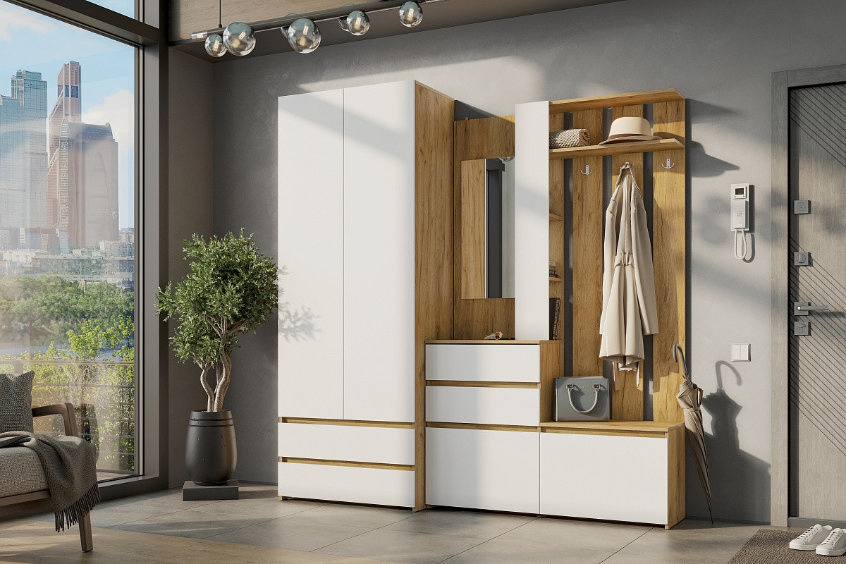 Оригинальный дизайн гарнитура – главная особенность прихожей этой модели. Он будет органично смотреться в интерьере, оформленном в классическом стиле.