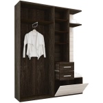 Прихожая «Танго-2» – вместительная и функциональная модель, которая прекрасно подойдет для современной прихожей. Мебель для прихожей включает в себя широкий платяной шкаф с выдвижной штангой, обувницу с откидной дверцей, выдвижные ящики для мелочей, открытые полки и вешалки с крючками для сезонной одежды.