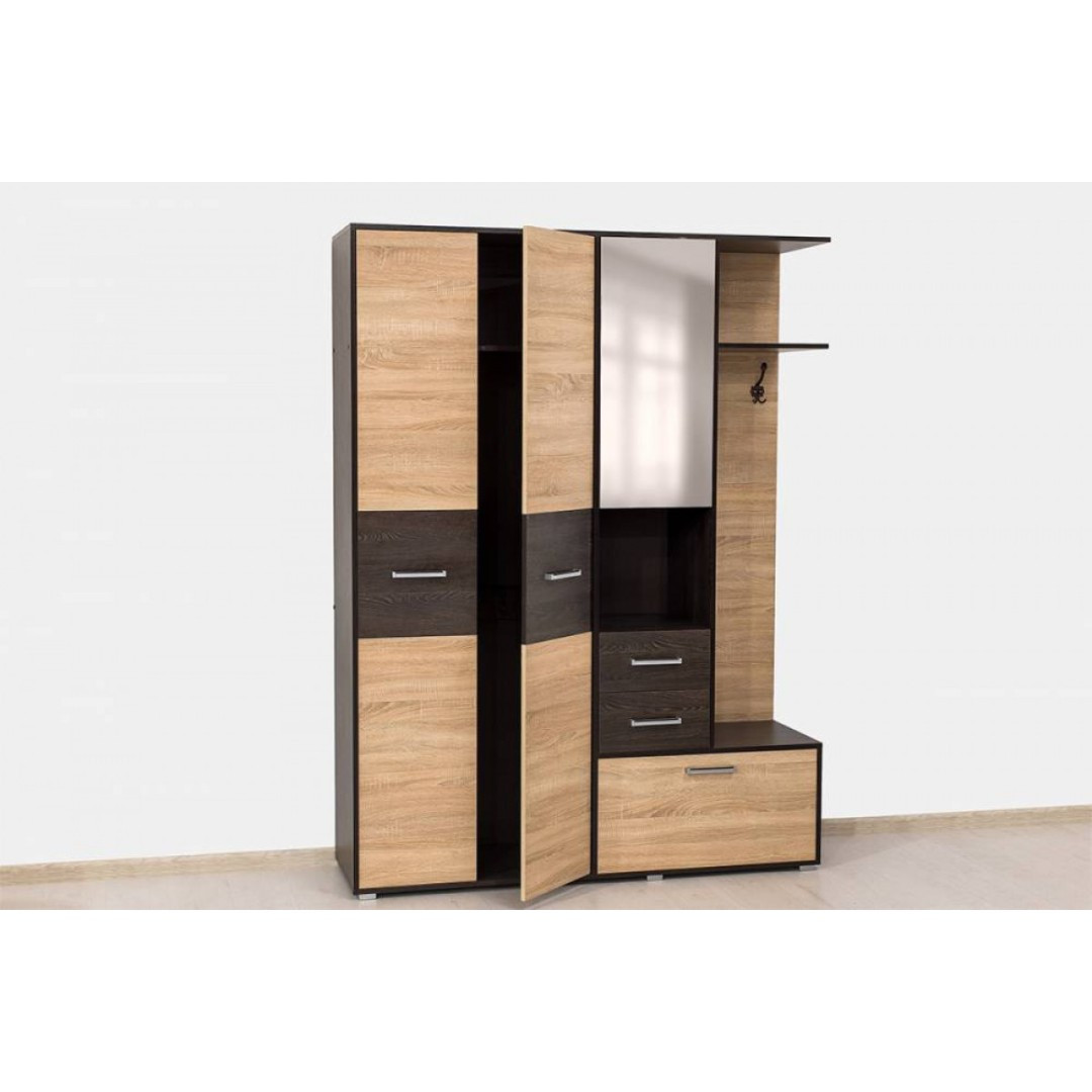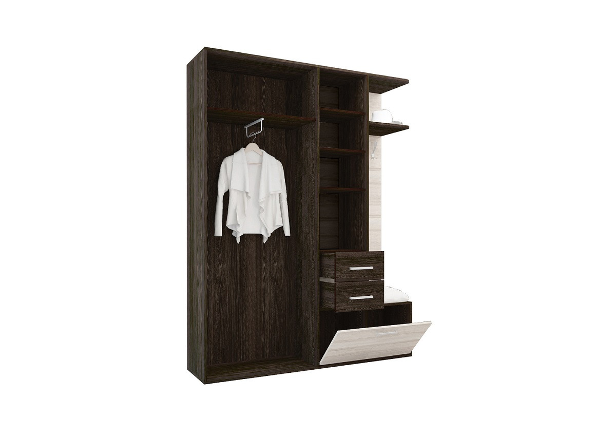 Прихожая «Танго-2» – вместительная и функциональная модель, которая прекрасно подойдет для современной прихожей. Мебель для прихожей включает в себя широкий платяной шкаф с выдвижной штангой, обувницу с откидной дверцей, выдвижные ящики для мелочей, открытые полки и вешалки с крючками для сезонной одежды.