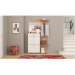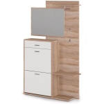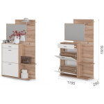 Состоит из вешалки с металлической штангой и крючками, полок, вместительной тумбы для обуви и зеркала. Сочетание нейтральных цветов дуба сономы и белого придает конструкции легкость и создает в помещении теплоту и необычайный уют, а зеркало зрительно увеличивает пространство.