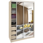 За раздвижными дверями находятся две секции и шуфлядный блок. Правая секция оборудована штангой для хранения одежды на плечиках, нижней полкой и антресолью. В левой части расположены 3 съёмные полки и 3 выдвижных ящика.