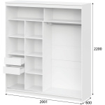 Изделие представляет собой Шкаф с двумя створками купе. Левое отделение оснащено полками и двумя выкатными ящиками, правое отделение оснащено штангой для хранение одежды на вешалках. Размер ящиков: ШхВхГ 404x100x334. Нагрузка на ящики — max 7кг. Декоративные элементы приклеиваются к створкам на производстве. Створки универсальные.