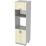 Шкаф предназначен для установки встраиваемого духового шкафа и микроволновой печи. Вместо духового шкафа можно установить кухонный комбайн или мультиварку. За открывающимися фасадами предусмотрено место для хранения кухонной утвари.