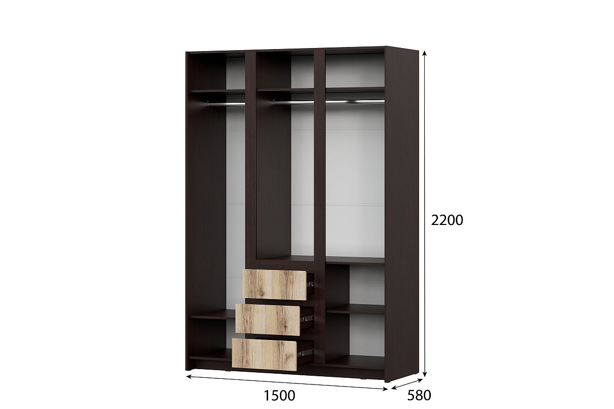 Шкаф разделен вертикальной перегородкой на два отделения. Слева — отделение с двумя стационарными полками сверху и снизу и металлической штангой. Справа — отделение со стационарной полкой и штангой вверху и
