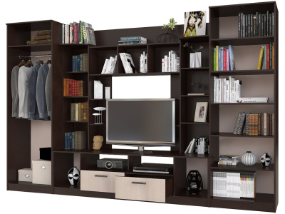 Модель оснащена центральной секцией с нишей для ТВ, множеством открытых и закрытых полок, выдвижными ящиками и двумя шкафами, отличающимися по наполнению.
