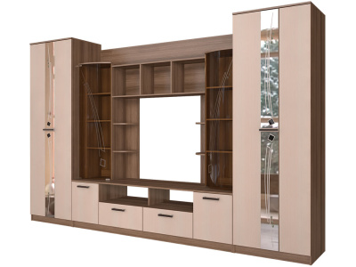 Модель оснащена центральной секцией с нишей для ТВ, множеством открытых и закрытых полок, выдвижными ящиками и двумя шкафами, отличающимися по наполнению.