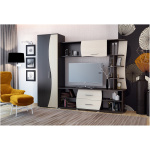 Гостиная «Капри» — вместительная и стильная модель. Это изящное и универсальное решение для современного интерьера. Практичная и оригинальная стенка максимально организует пространство, а также добавит динамики в пространство за счет своих необычных форм и контрастного цветового решения. Композиция включает в себя платяной шкаф и центральную часть с множеством полок и просторной нишей под TV.
