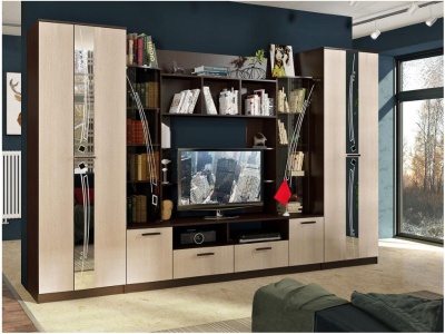 Шикарная, современная и многофункциональная гостиная. В оформлении фасадов использован пескоструйный рисунок на зеркалах. Витрины с тонированными стеклами.