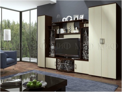Актуальная модель с большой нишей под ТВ. Стеклянные дверцы стеллажей декорированы оригинальным узором. Роскошный вариант для стильного интерьера! Гостиная Виста — для ценителей уюта и красоты!