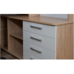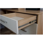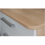 В столах системы Гарвард мягкие, удобные для опирающихся рук края, с кромкой в 2мм, а также, скруглённые углы столешницы. Корпус выполнен в теплом древесном цвете светлого дуба с приятной на ощупь фактурой, фасады — белые матовые. Нейтральные оттенки мебели позволяют легко вписаться уже в готовый интерьер любого помещения.