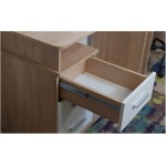 В столах системы Гарвард мягкие, удобные для опирающихся рук края, с кромкой в 2мм, а также, скруглённые углы столешницы. Корпус выполнен в теплом древесном цвете светлого дуба с приятной на ощупь фактурой, фасады — белые матовые. Нейтральные оттенки мебели позволяют легко вписаться уже в готовый интерьер любого помещения.