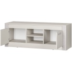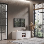 Изделие состоит из двух центральных открытых ниш, а также полок, спрятанных за распашными дверцами. На столешнице вы сможете разместить телевизор, а в зонах хранения – необходимые вещи и технику.
