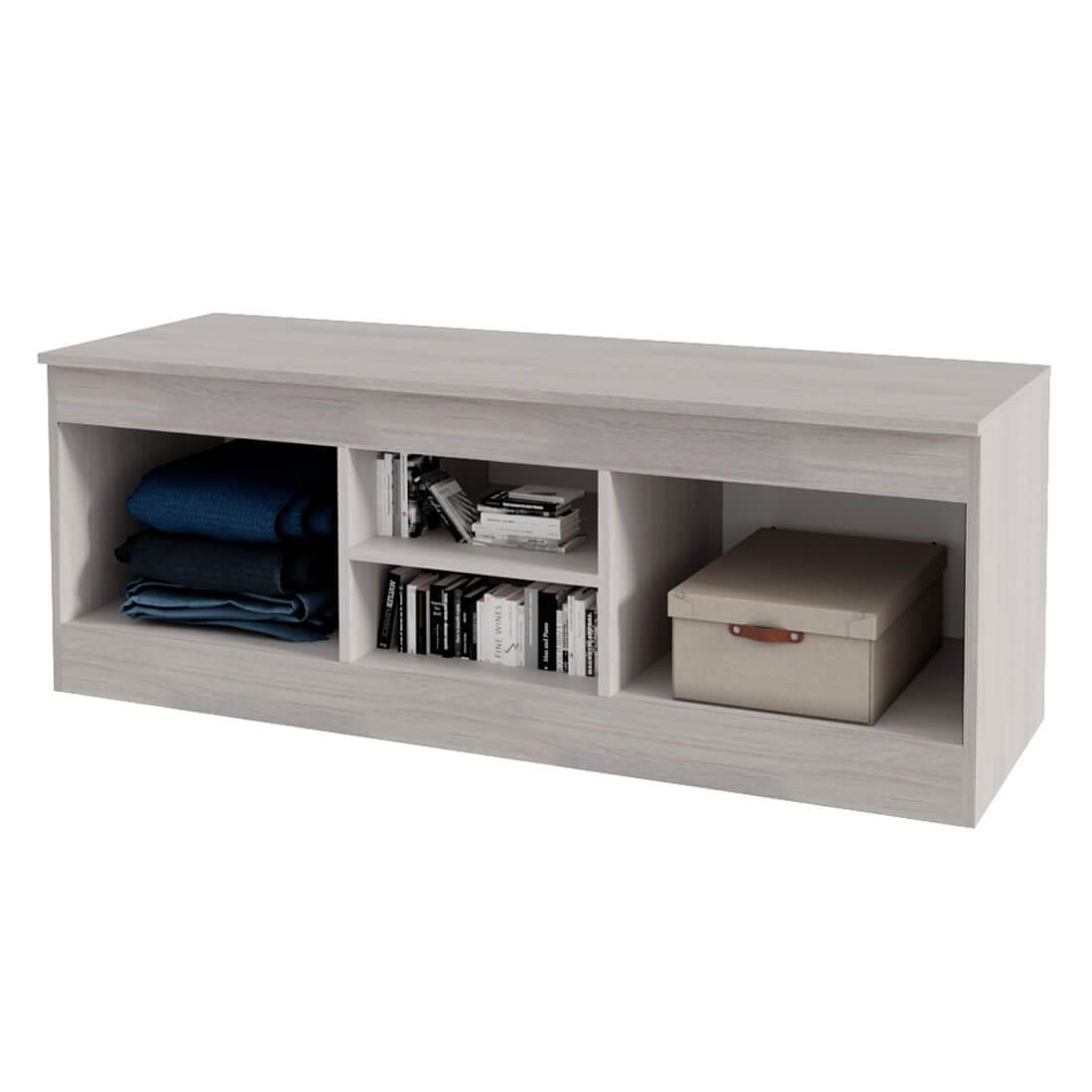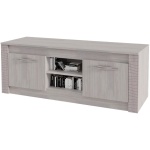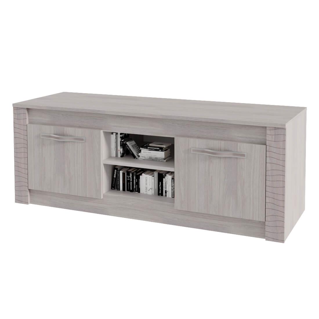 Изделие состоит из двух центральных открытых ниш, а также полок, спрятанных за распашными дверцами. На столешнице вы сможете разместить телевизор, а в зонах хранения – необходимые вещи и технику.