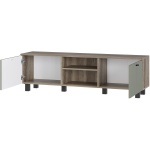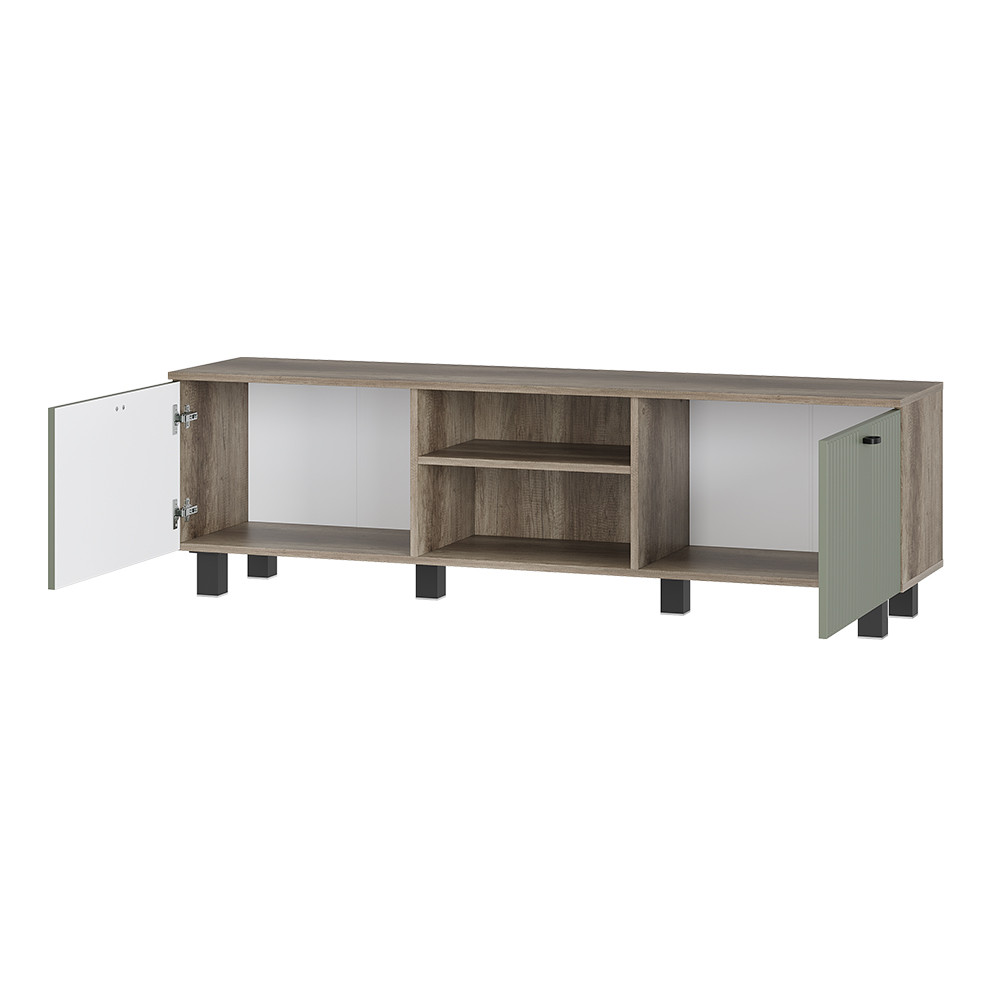 Изделие состоит из двух центральных открытых ниш, а также полок, спрятанных за распашными дверцами. На столешнице вы сможете разместить телевизор, а в зонах хранения – необходимые вещи и технику.