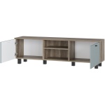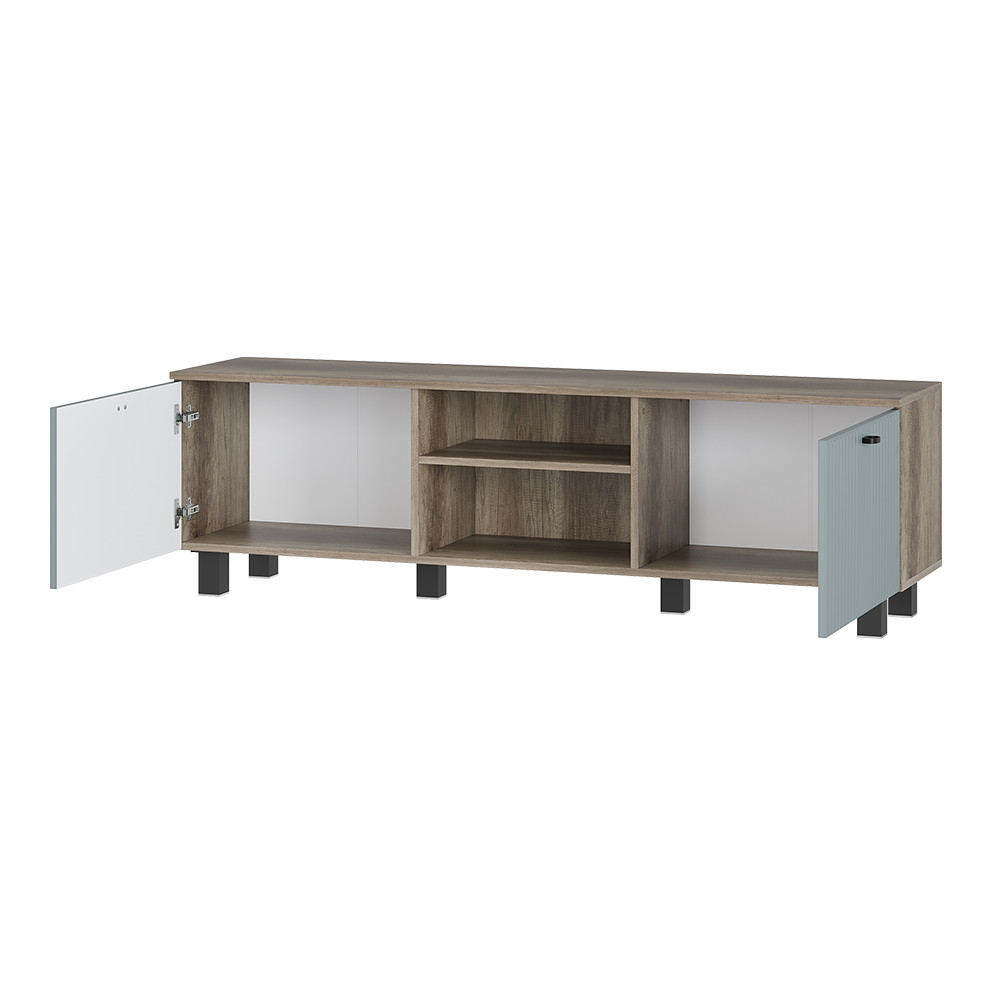 Изделие состоит из двух центральных открытых ниш, а также полок, спрятанных за распашными дверцами. На столешнице вы сможете разместить телевизор, а в зонах хранения – необходимые вещи и технику.