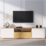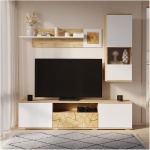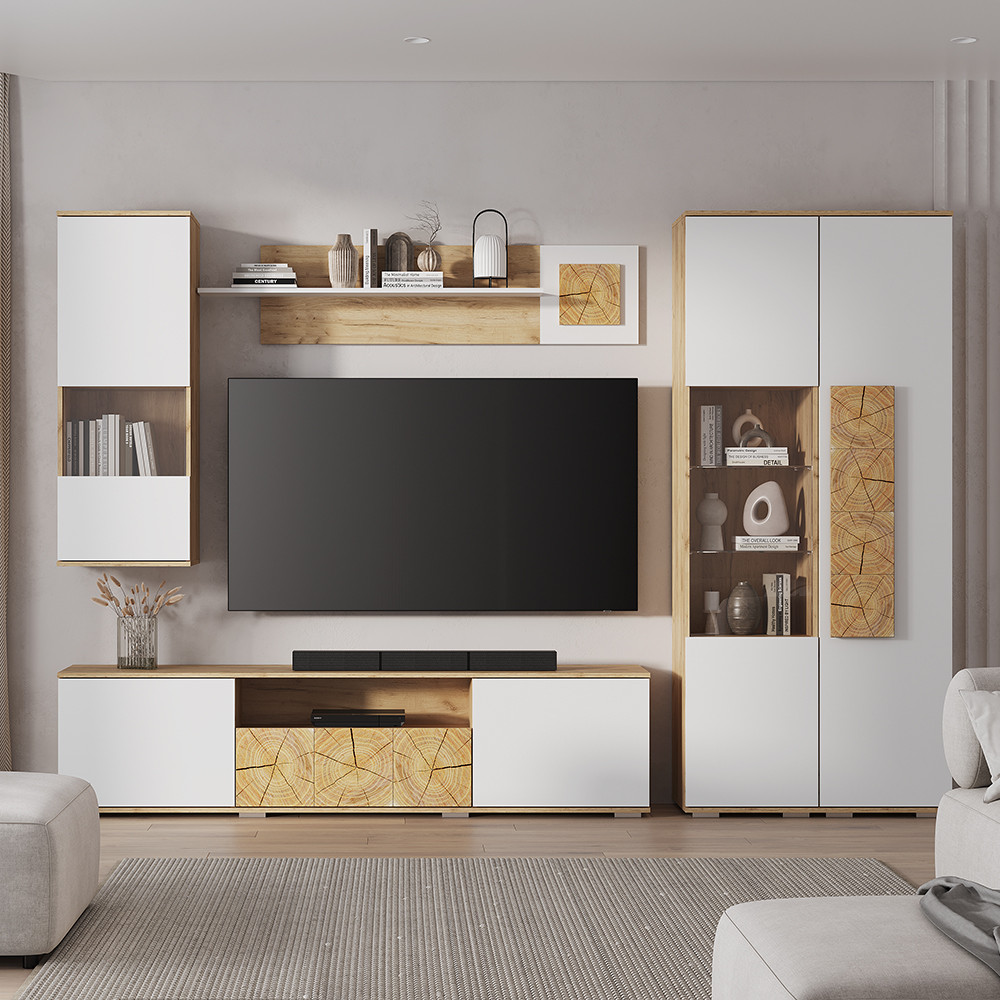 Яркий штрих модели — стильные вставки, стилизованные под спил дерева. Тумба  отлично дополнит гостиную, на ней можно разместить телевизор и приставку, а также небольшую технику и колонку.