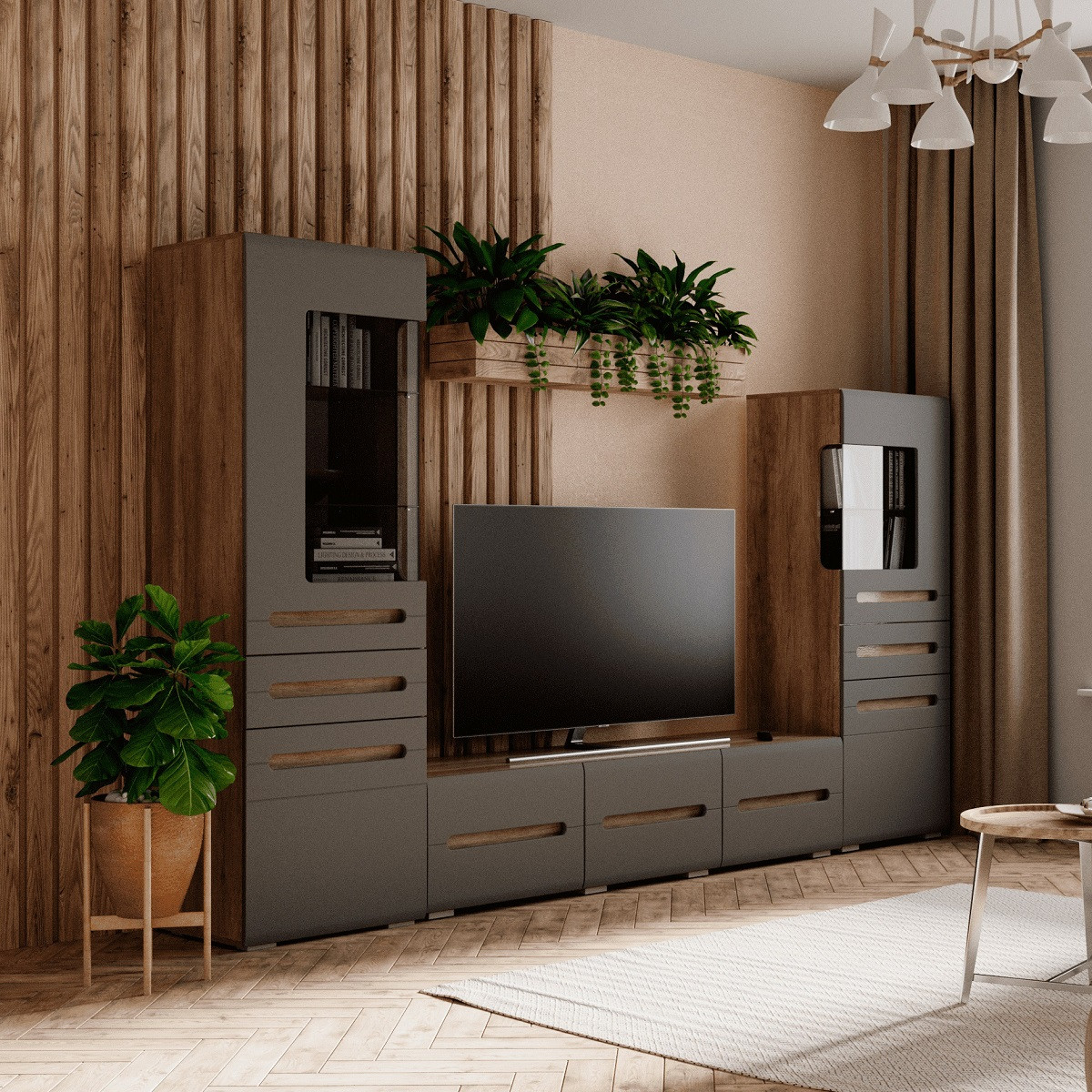Стильная и очень вместительная тумба под ТВ «Наоми» выполнена из качественной ЛДСП в цвете «Дуб каньон», а фасаы отделаны МДФ темного серого цвета. На столешнице тумбы поместится телевизор практически любого размера, а в нишах можно хранить необходимую технику.