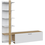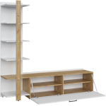 1. Блок с полками. Состоит из щита, одного внешнего бока и пяти полок. Пересекается в нижней своей части единой с тумбой столешницей. Щит и 5 полок выполнены в белом цвете, столешница и внешний бок — в цвете Дуб Крафт золотой. Размеры: полок 385х330мм, внешнего бока 74х1560мм, щита 385х1560мм. Расстояние между полками 272мм. Отступ верхней полки от верхнего края щита 56мм. Расстояние нижней полки до столешницы 259мм. Полка под столешницей крепится также к корпусу тумбы при помощи евростяжек.
